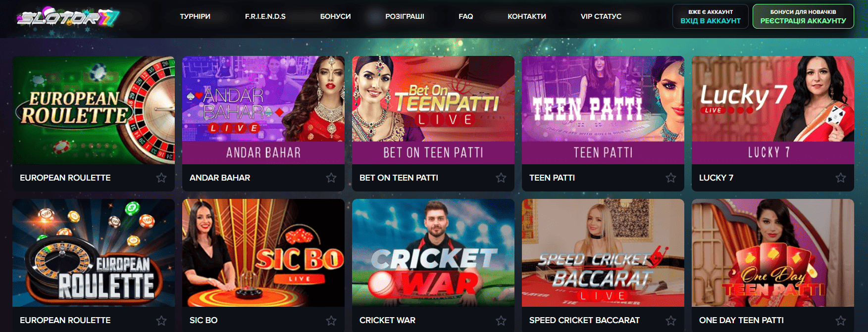 • розважальні шоу – Cricket War, Andar Bahar, Teen Patti, Lucky 7 тощо.