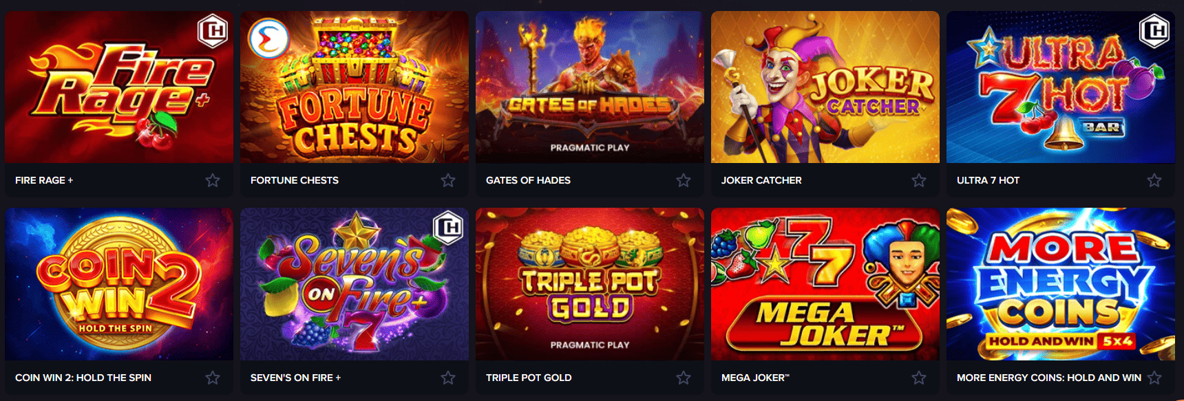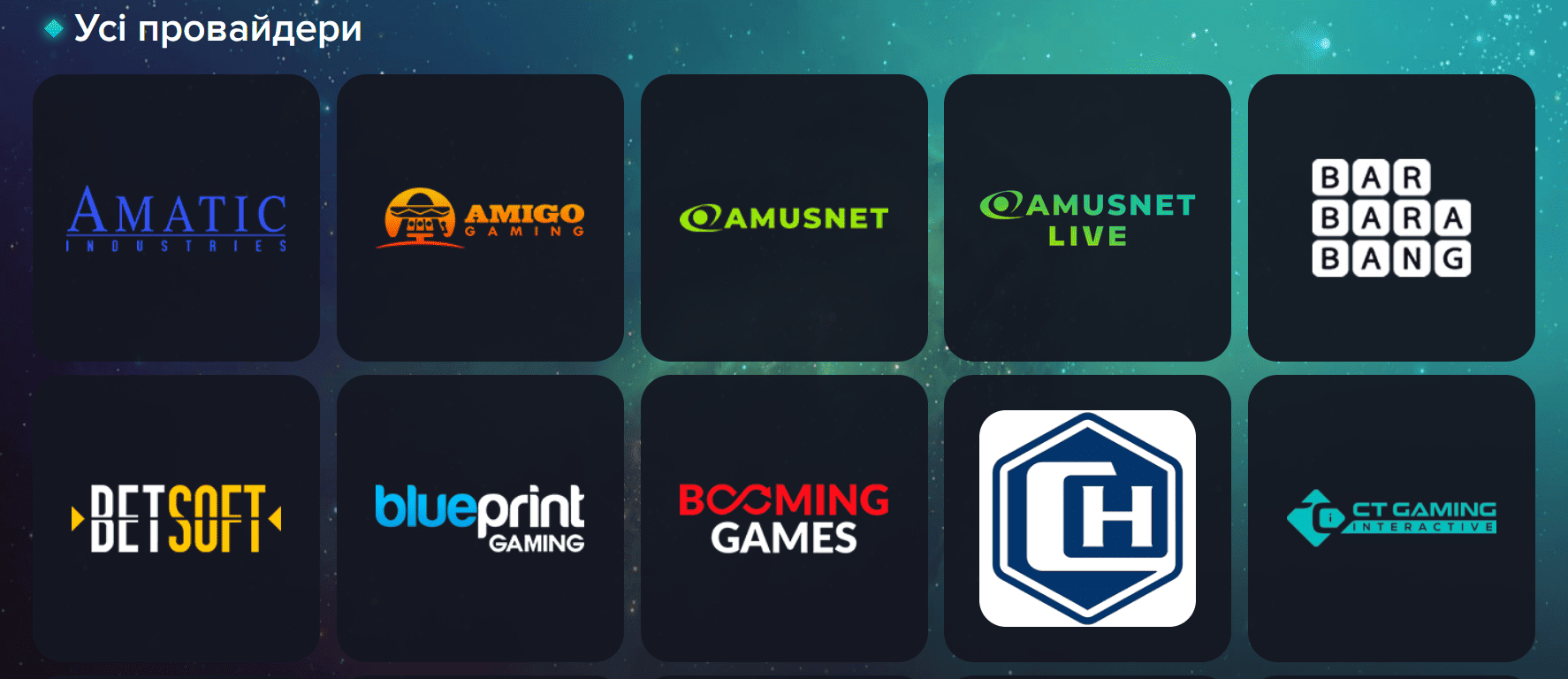 ПровайдериBetsoft Gaming, Amusnet, Champion, Amatic, Ezugi, Fugaso, Habanero, Booming Games, KA Gaming, NetGame, SmartSoft та інше